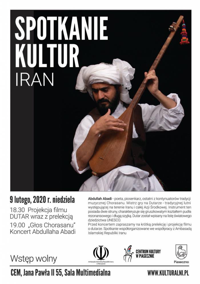 Spotkanie Kultur: Iran 9.02.2020 niedziela. 18:30 Projekcja filmu DUTAR wraz z prelekcją. 19:00 „Głos Chorasanu”- Koncert Abdullaha Abadi. Miejsce: CEM, Jana Pawła II 55, Sala Multimedialna.