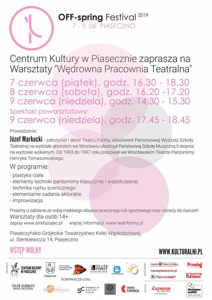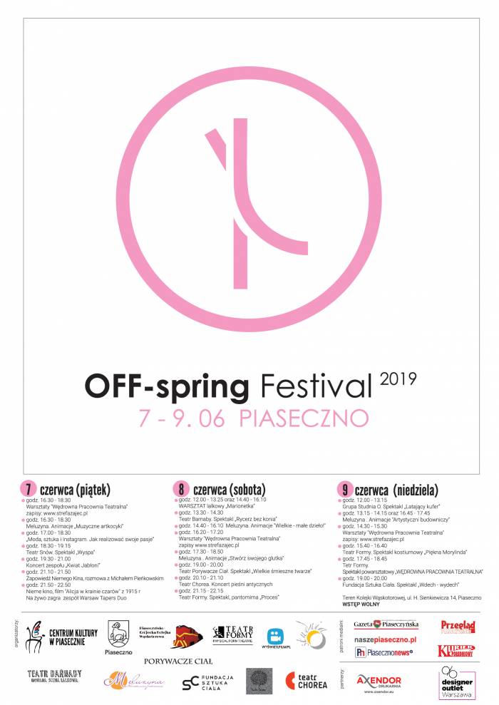 W dniach 7-9 czerwca 2019 roku zapraszamy na IV OFF-spring Festival. Wszystkie wydarzenia odbywają się na terenie Kolejki Wąskotorowej (ul. Sienkiewicza 14, Piaseczno). Wstęp wolny.