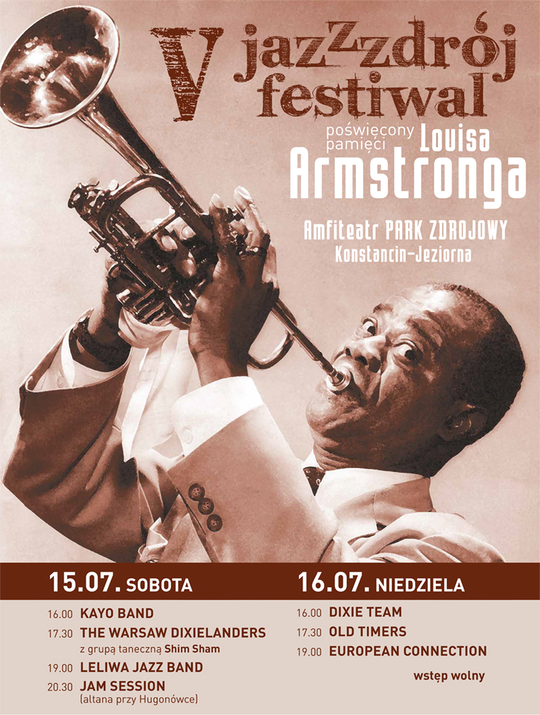 15-16 lipca 2017 r. odbędzie się Jazz Zdrój Festiwal. Miejsce: Amfiteatr, Park Zdrojowy. Jazz Zdrój Festiwal organizowany od pięciu lat przez Konstanciński Dom Kultury to wyjątkowe wydarzenie muzyczne poświęcone pamięci wybitnego jazzmana, Louisa Armstronga.