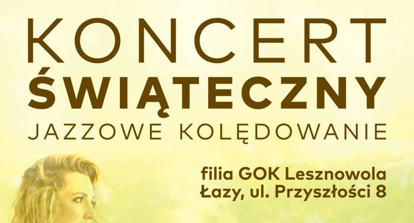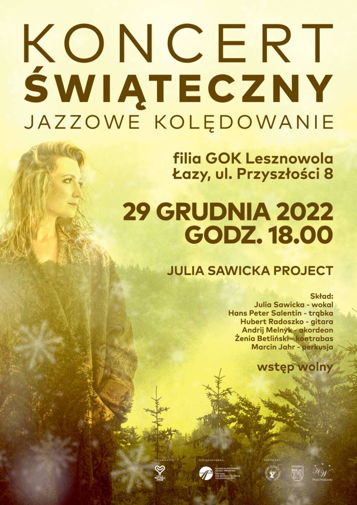 Gminny Ośrodek Kultury w Lesznowoli zaprasza na Koncert Świąteczny Jazzowe Kolędowanie w wykonaniu formacji Julia Sawicka Project. Termin 29.12.2022 godz. 18.00. Miejsce: filia GOK Lesznowola w Łazach, ul. Przyszłości 8 Wstęp wolny.