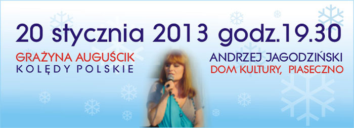 20 stycznia 2013 roku zapraszamy na koncert Grażyny Auguścik i Andrzeja Jagodzińskiego zatytułowany Kolędy Polskie. Koncert rozpocznie się o godz. 19.30 w sali Domu Kultury przy ul. Kościuszki 49 w Piasecznie. Bilety wstępu w cenie 15 zł. Grażyna Auguścik - polska wokalistka jazzowa. Śpiewa utwory nawiązujące do polskiej muzyki ludowej, muzyki latynoskiej i klezmerskiej. Andrzej Jagodziński - polski pianista jazzowy. Zapraszamy na niedzielny koncert.