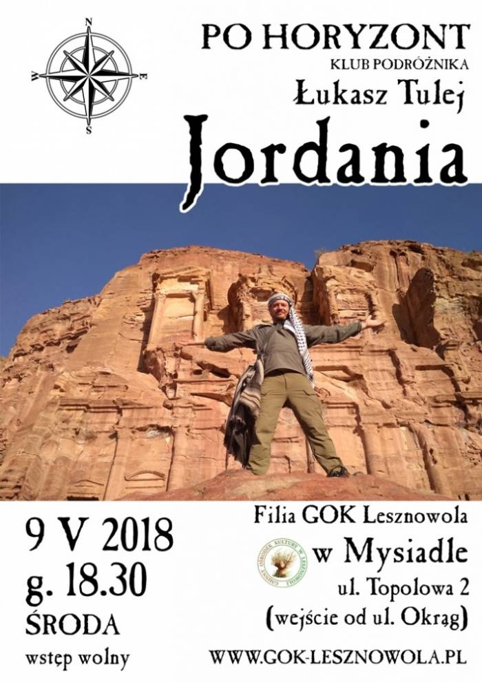 09.05.2018 r. godz. 18.00 - Klub Podróżnika Po Horyzont - Jordania. Spotkanie z Łukaszem Tulejem. Miejsce: filia GOK Lesznowola w Mysiadle, ul. Topolowa 2