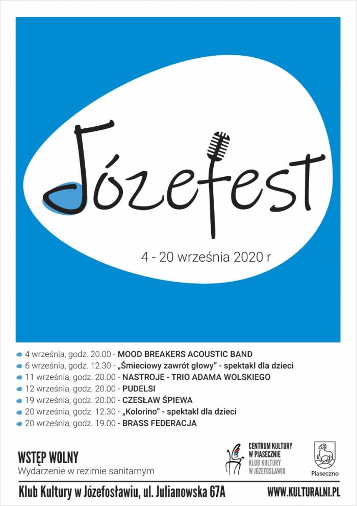 JÓZEFEST 4-20 września 2020 r Józefosław, Klub Kultury, ul. Julianowska 67A. (scena plenerowa). Wstęp wolny. Wydarzenie odbędzie się w reżimie sanitarnym. We wrześniu Józefosław rozkwitnie kulturą. A to za sprawą nowego festiwalu plenerowego Józefest, który miejmy nadzieję na stałe wpisze się w kalendarz wydarzeń artystycznych okolicy.