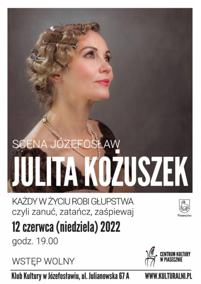 SCENA JÓZEFOSŁAW. JULITA KOŻUSZEK KAZDY W ŻYCIU ROBI GŁUPSTWA czyli zanuć, zatańcz, zaśpiewaj 12 czerwca (niedziela) 2022 godz. 19.00 wstęp wolny Klub Kultury w Józefosławiu, ul. Julianowska 67A