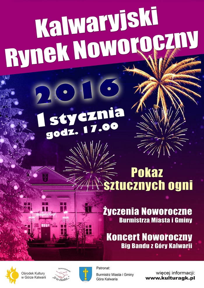 1 stycznia 2016 roku zapraszamy na Kalwaryjski Rynek Noworoczny. Miejsce: Skwer przed Ratuszem w Górze Kalwarii. Więcej informacji na plakacie: