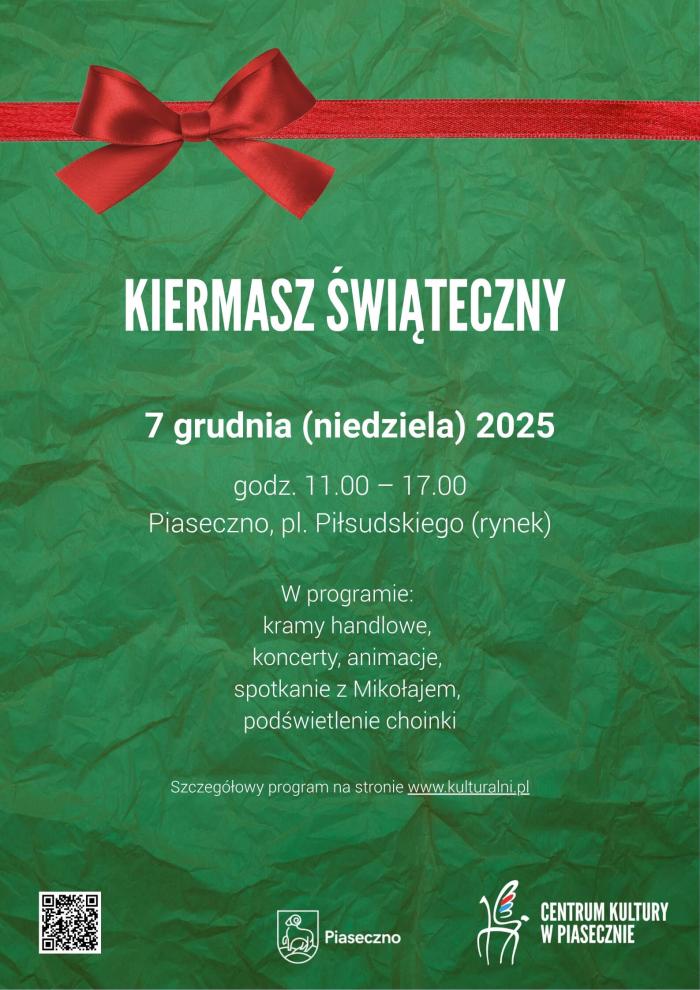 7 grudnia (niedziela) 2025 r. w godz. 11.00 – 17.00 odbędzie się Kiermasz Świąteczny 2025. Miejsce: Rynek, pl. Piłsudskiego 9 oraz Zakątek Kultury, w którym będzie Zakątek Mikołaja. Wstęp wolny.