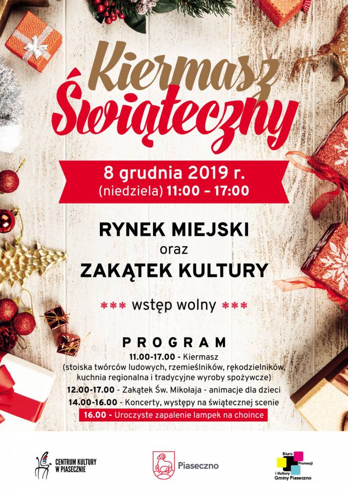 8 grudnia 2019 roku w godz. 11.00-17.00 odbędzie się coroczny KIERMASZ ŚWIĄTECZNY na Rynku w Piasecznie.