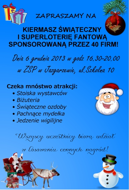 6 grudnia 2013 roku zapraszamy na kiermasz i wielką loterię fantową do Zespołu Szkół w Jazgarzewie. Już po raz 11 w ZSP w Jazgarzewie odbędzie się charytatywny Kiermasz Bożonarodzeniowy połączony z loterią fantową i koncertem. Będzie on miał miejsce 6 grudnia w godz. 16.30 - 20.00. Jak co roku organizatorzy liczą na wysoką frekwencję i pomoc z Państwa strony.