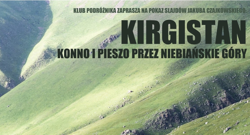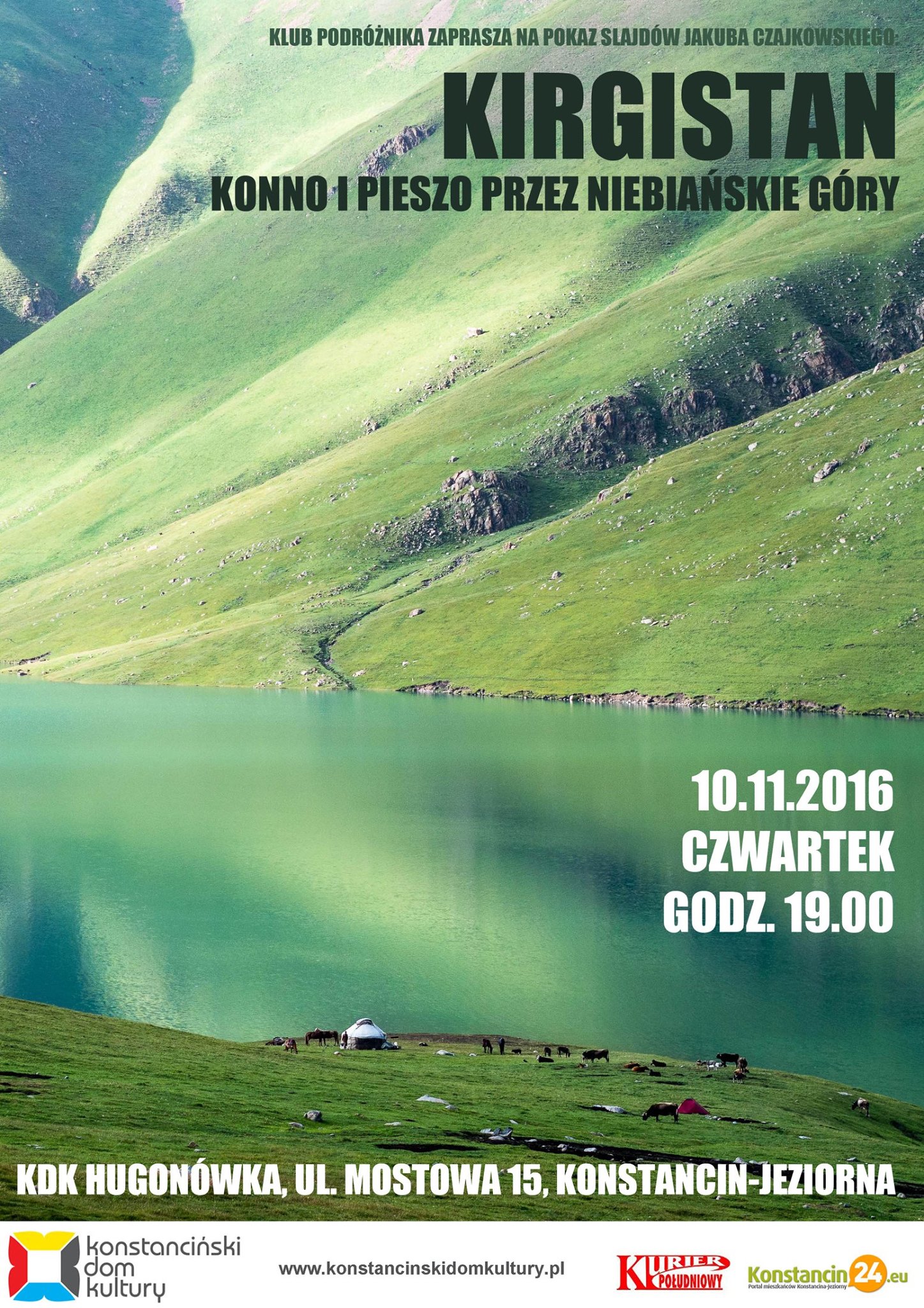10.11.2016 r. o godz. 19.00 zapraszamy w podróż do Kirgistanu. Miejsce: KDK Hugonówka. Ten środkowoazjatycki górzysty kraj nie bez powodu staje się coraz popularniejszym kierunkiem podróżniczym. Odnajdziemy w nim zabytki Jedwabnego Szlaku, dziką przyrodę, gościnnych ludzi oraz wspaniałą kuchnię. Ruszymy pieszo, a potem konno w Niebiańskie Góry, czyli Tien-szan. Z czterotysięcznych szczytów będziemy podziwiać obłędne górskie krajobrazy. Dotrzemy nad malownicze jeziora, w tym drugie największe górskie jezioro świata. Wsiądziemy też na konie i pogalopujemy przez stepy, odwiedzając kirgiskich pasterzy w ich jurtach.