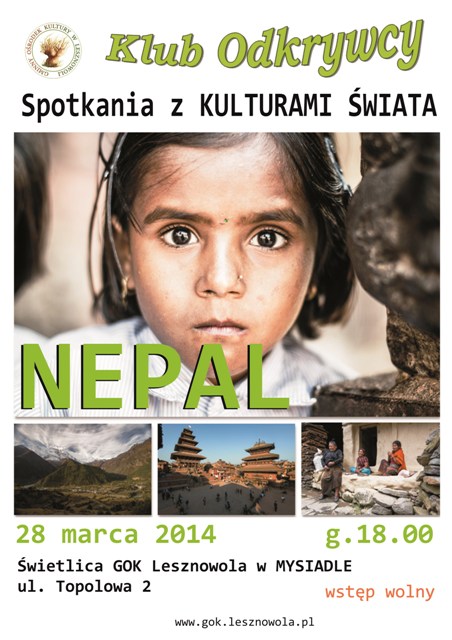28 marca 2014 roku o godz. 18.00 zapraszamy na spotkanie Klubu Odkrywcy: fotografie Adama Hofmana pt. "Nepal". Podczas wieczoru odbędzie się pokaz slajdów i opowieści autora o egzotycznej podróży. Miejsce: Galeria PASAŻ w świetlicy GOK Lesznowola w Mysiadle, ul. Topolowa 2. Zapraszamy!