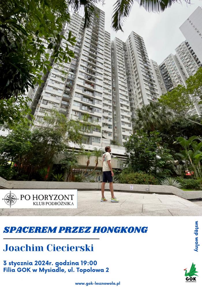 Zapraszamy na kolejne spotkanie z cyklu: "Klub Podróżnika". Jako prelegent wystąpi Joachim Ciecierski, który przebył 125 kilometrów pieszo przez Hongkong. Wydarzenie odbędzie się 3 stycznia 2024 roku o godzinie 19:00 w filii GOK w Mysiadle przy ulicy Topolowej 2.