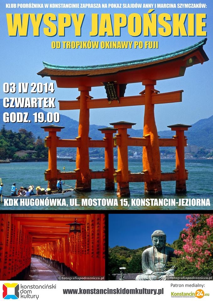 3 kwietnia 2014 roku o godz. 19.00 zapraszamy do Klubu Podróżnika, którego gościem będą Ania i Marcin Szymczakowie - "Wyspy Japońskie - Od Tropików, Okinawy po Fuji". Miejsce: KDK Hugonówka ul.Mostowa 15, Konstancin-Jeziorna. Wstęp wolny. Zapraszamy.