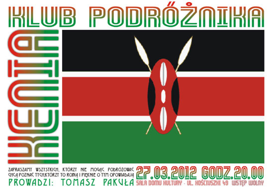 27 marca 2012 roku o godz. 20.00 zapraszamy do Klubu Podróżnika, gdzie będzie można obejrzeć zdjęcia z podróży do Kenii. Spotkanie w Centrum Kultury przy Kościuszki 49 poprowadzi Tomasz Pakuła. Wstęp wolny. Zapraszamy!