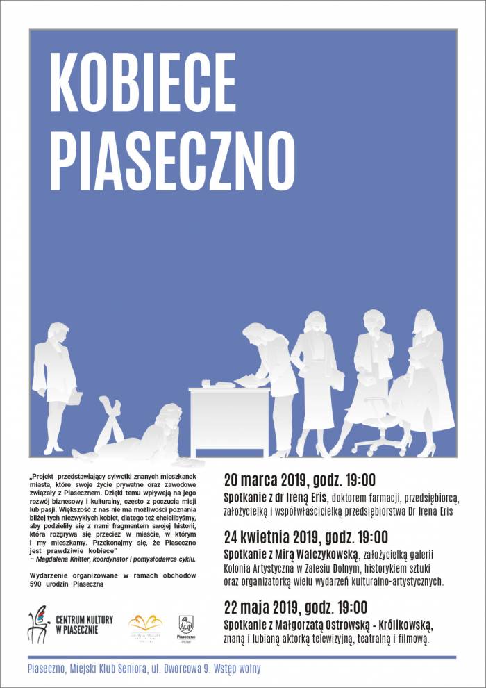 24 kwietnia o godz. 19:00 KOBIECE PIASECZNO. Spotkanie z Mirą Walczykowską, założycielką galerii Kolonia Artystyczna w Zalesiu Dolnym, historykiem sztuki oraz organizatorką wielu wydarzeń kulturalno-artystycznych.