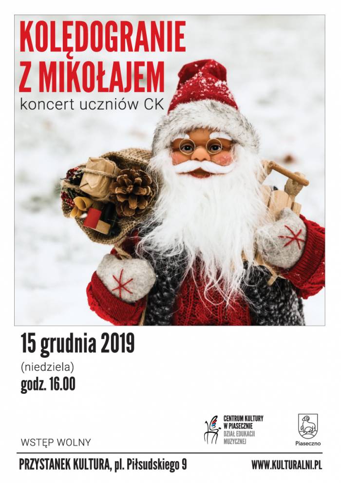 15 grudnia 2019 roku o godz. 16:00 odbędzie się KOLĘDOGRANIE Z MIKOŁAJEM, czyli koncert uczniów Centrum Kultury. Miejsce: Piaseczno, Przystanek Kultura, pl. Piłsudskiego 9. Wstęp wolny.