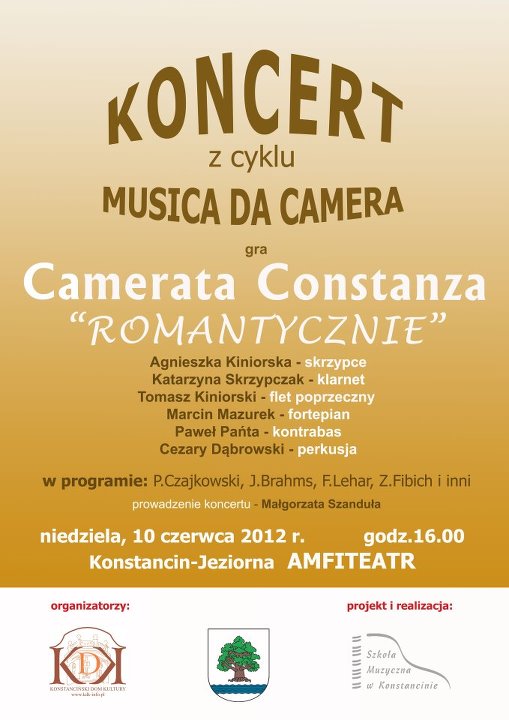 10 czerwca 2012 roku zapraszamy na koncert z cyklu Musica da Camera, który odbędzie w Parku Zdrojowym. Podczas koncertu wystąpi zespół Camerata Constanza, który zaprasza do spędzenia niedzieli w "Romantycznym" nastroju, który zbudują utwory m.in P.Czajkowskiego, J.Brahmsa i F.Lehara. Wstęp wolny. Zapraszamy.