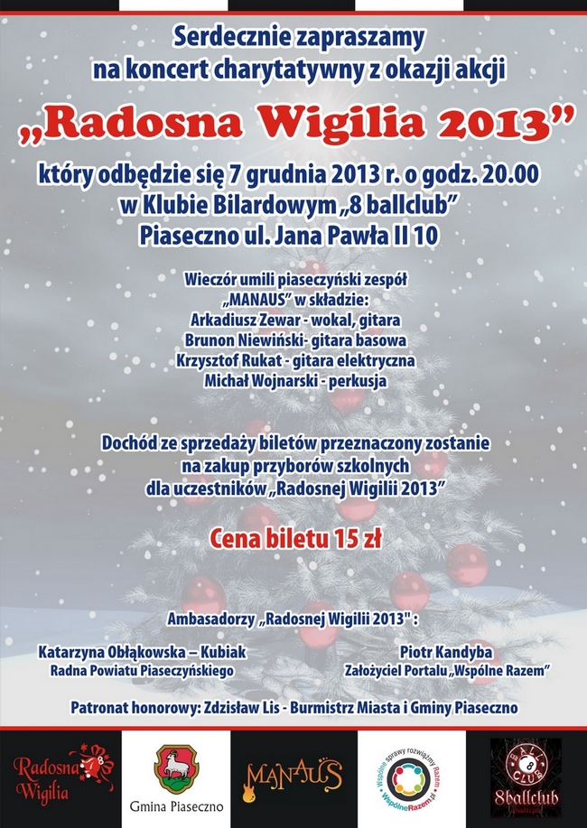 8 Ball Club po raz kolejny gra razem z zespołem Manaus na rzecz akcji Radosna Wigilia w Piasecznie. Dochód z biletów przeznaczamy na wsparcie najbardziej potrzebujących. Manaus zagra z tej okazji w niecodziennym składzie: Arkadiusz Zewar - wokal, gitara, Brunon Niewiński - gitara basowa, vokal, Krzysztof Rukat - gitara elektryczna, vokal, Michał Wojnarski - perkusja. Wstęp od godziny 20, bilety 15 pln.