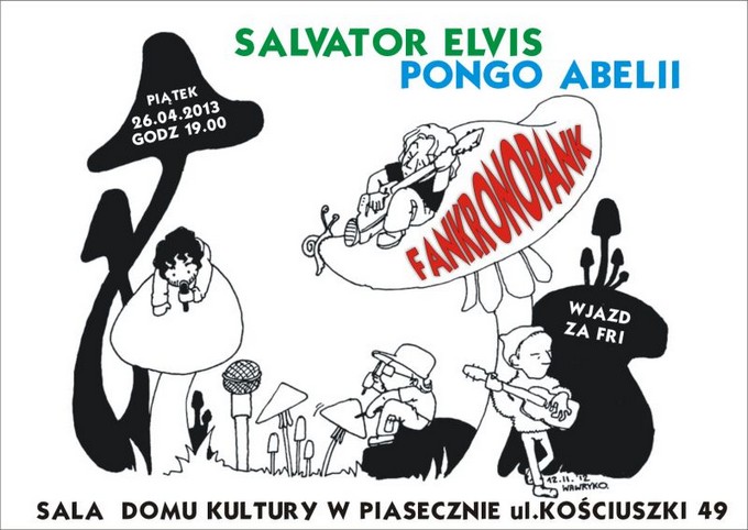 26 kwietnia 2013 roku o godz. 19.00 zapraszamy na koncert o wdzięcznej nazwie FANKRONOPANK. Wystąpią dla Państwa całkowicie za darmo zespoły: Salvator Elvis, Pongo Abelii. Koncert będzie miał miejsce w sali Domu Kultury, ul. Kościuszki 49. Wstęp wolny. Zapraszamy!