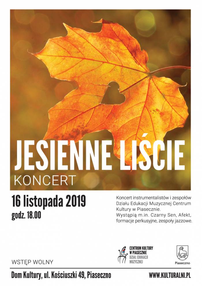 16 listopada (sobota), godz. 18.00 odbędzie się koncert „JESIENNE LIŚCIE”, czyli koncert instrumentalistów i zespołów Działu Edukacji Muzycznej Centrum Kultury w Piasecznie. Wystąpią m.in. Czarny Sen, Afekt, formacje perkusyjne, zespoły jazzowe.