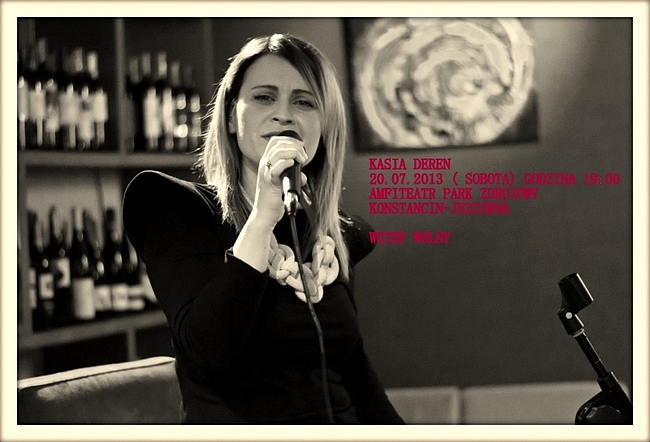 20 lipca 2013 roku o godz. 19.00 zapraszamy na koncert akustyczny Kasi Dereń. Miejsce: Amfiteatr w Parku Zdrojowym, Konstancin-Jeziorna. Śpiewanie to wielka pasja i jednocześnie sposób na życie Kasi. Artystka kształciła swój wokal pod okiem Grażyny Alber- ukończyła jej 4 - letnie studium w 2 lata. Jest laureatką festiwali m.in. w Opolu (Debiuty), festiwalu Piosenki Studenckiej w Krakowie, Festiwali Fama. Wstęp wolny. Zapraszamy!