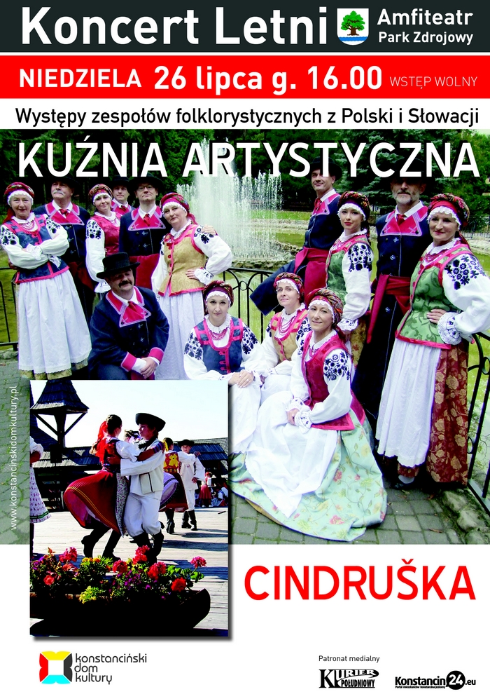 26 lipca, godz. 16.00 odbędzie się koncert Kuźni Artystycznej. Miejsce: Amfiteatr, Park Zdrojowy. Wstęp wolny. Zespół Kuźnia Artystyczna działa przy Centrum Kultury Wilanów, a jego choreografem i kierowniczką artystyczną jest Agnieszka Nagnajewicz. Zespół prezentował polskie tańca w wielu krajach: na Ukrainie, Słowacji, na Węgrzech oraz w Czechach, Niemczech, Bułgarii i Francji. Dla konstancińskiej publiczności zatańczy kujawiaka z oberkiem w strojach wilanowskich, tańce górali piwniczańskich oraz mazura w strojach szlacheckich.