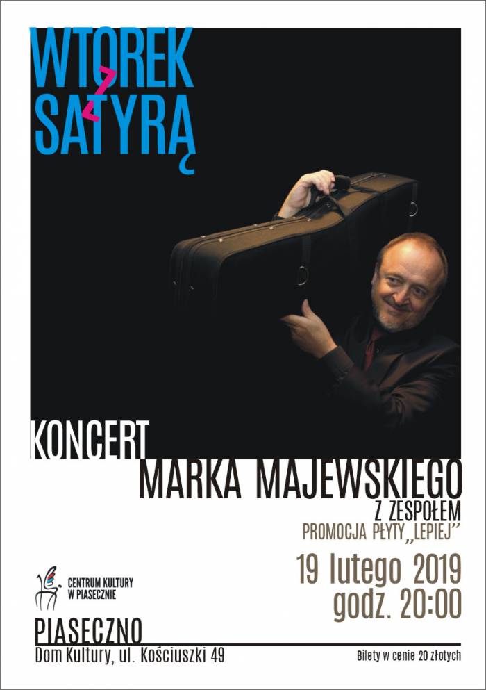 19 lutego 2019 roku o godz. 20.00 zapraszamy na WTOREK Z SATYRĄ, czyli Marek Majewski zaprasza. Podczas wydarzenia odbędzie się koncert Marka Majewskiego z zespołem, który będzie promował płytę "Lepiej". Miejsce: Piaseczno, ul. Kościuszki 49 (Dom Kultury). Bilety w cenie 20 złotych.