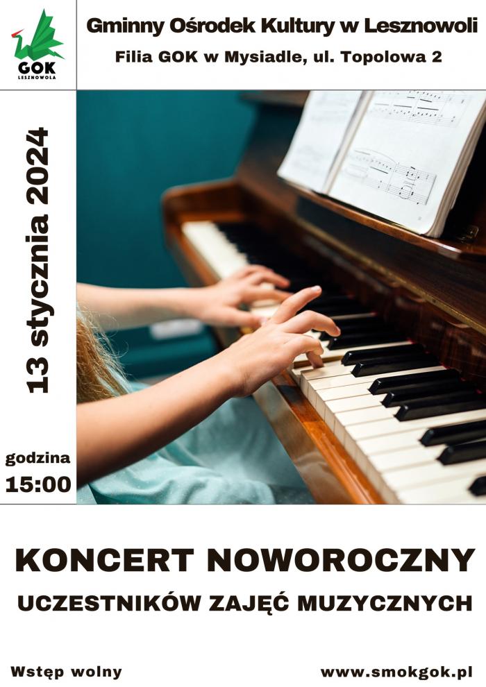 Zapraszamy na koncert noworoczny uczestników zajęć muzycznych Gminnego Ośrodka Kultury w Lesznowoli. Wydarzenie odbędzie się 13 stycznia 2024 roku o godzinie 15:00 w filii GOK w Mysiadle przy ulicy Topolowej 2. Wstęp wolny!
