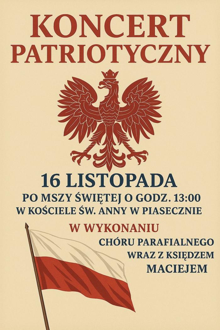 Parafia św. Anny w Piasecznie zaprasza wszystkich parafian i gości w najbliższą niedzielę 16 listopada 2025 roku o godz. 13:00 na Mszę Świętą w intencji naszej Ojczyzny, a następnie na koncert patriotyczny w wykonaniu naszego chóru parafialnego wraz z ks. Maciejem.