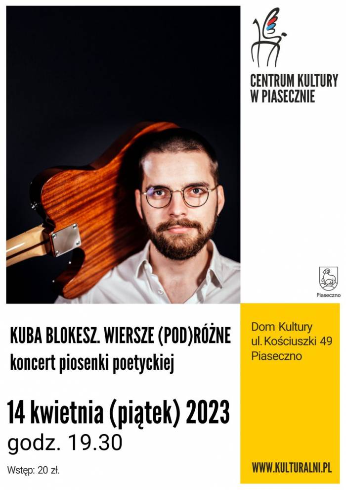 Centrum Kultury w Piasecznie zaprasza mieszkańców na koncert piosenki poetyckiej, który odbędzie się w Domu Kultury przy ul. Kościuszki 49 w Piasecznie. Wstęp 20 zł. Podczas koncertu wystąpi KUBA BLOKESZ.