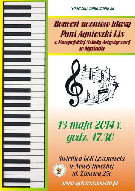 Zapraszamy na gościnny koncert uczniów Europejskiej Szkoły Artystycznej klasy pod kierunkiem p. Agnieszki Lis. Koncert odbędzie się we wtorek, dn. 13.05.2014 r. o g. 17.30. Miejsce: świetlica GOK Lesznowola w Nowej Iwicznej przy ul. Zimowej 25c. Wstęp wolny.