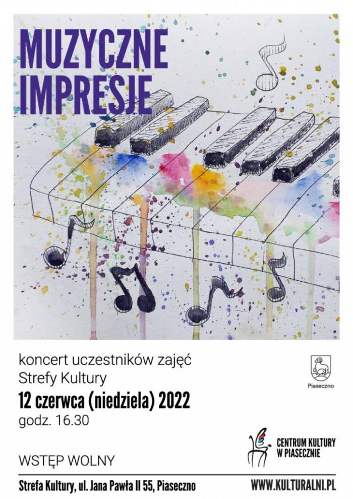 MUZYCZNE IMPRESJE koncert uczestników zajęć Strefy Kultury 12 czerwca (niedziela) 2022 godz. 16.30 wstęp wolny Strefa Kultury, ul. Jana Pawła II 55, Piaseczno