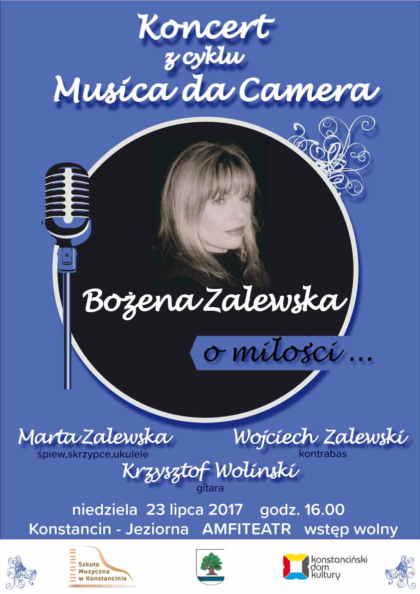 Bożena Zalewska występowała w wielu krajach Europy, a także na Kubie. Przez kilka lat wraz z zespołem Crossover koncertowała w Norwegii i Niemczech. Współpracuje ze Szkołą Muzyczną w Konstancinie prowadząc Studio Piosenki oraz zajęcia ze śpiewu. Od 2002 roku koncertuje i nagrywa z własnym kwartetem jazzowym, zapraszając do współpracy najlepszych polskich muzyków jazzowych. W tej odsłonie wokalistce towarzyszyć będą na kontrabasie: Wojciech Zalewski oraz na gitarze: Krzysztof Woliński. Dodatkowym wydarzeniem niedzielnego popołudnia będzie udział w koncercie Marty Zalewskiej, niezwykle wszechstronnej artystki, wokalistki, kompozytorki, autorki tekstów i multiinstrumentalistki. Wstęp wolny.