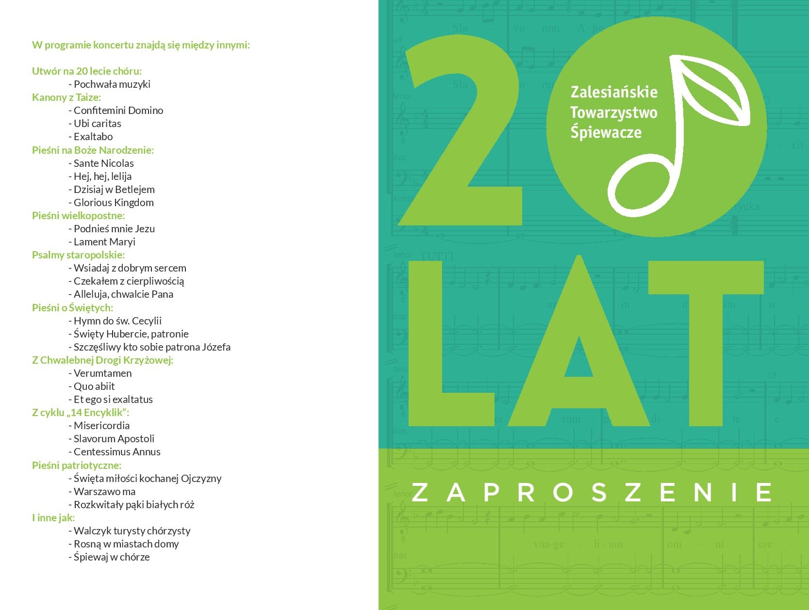 Na program koncertu w wykonaniu chóru ZTŚ pod dyrekcją Stanisława Szczycińskiego złożą się wybrane utwory będące odbiciem muzycznej drogi, jaką zespół przeszedł przez 20 lat swojego istnienia. Od kanonów z Taize aż do utworu specjalnie stworzonego na jubileusz.