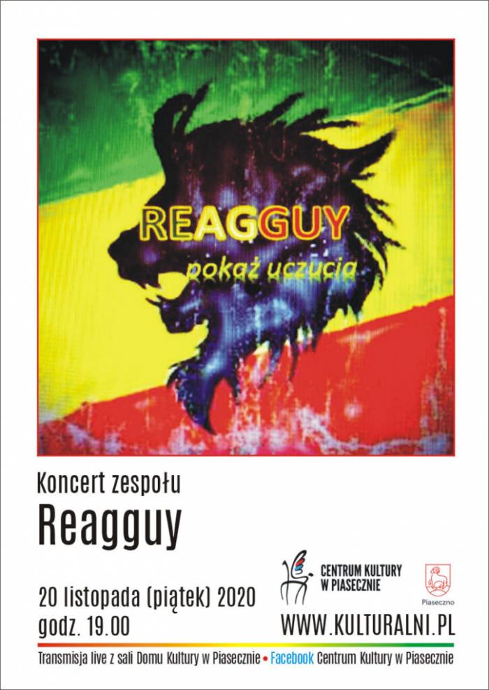 Koncert zespołu Reagguy 20 listopada (piątek) 2020 godz. 19:00 Transmisja live z sali Domu Kultury w Piasecznie Facebook Centrum Kultury w Piasecznie