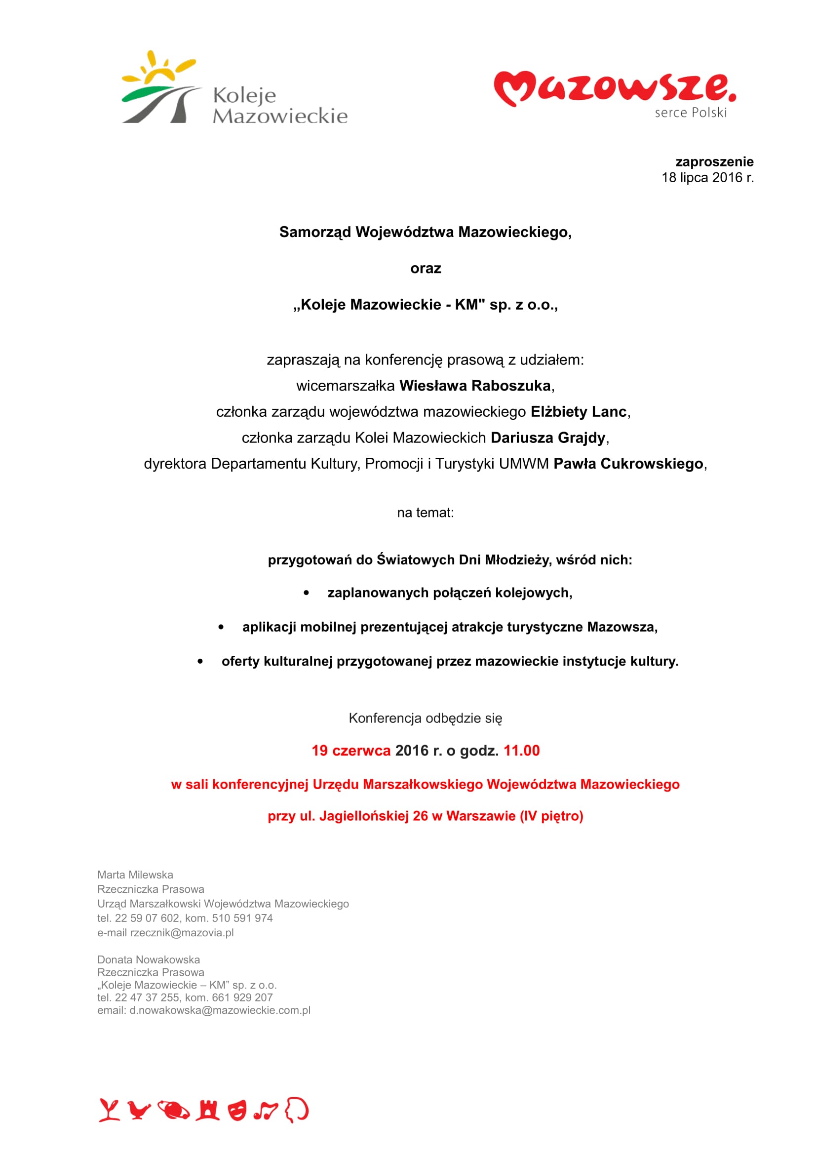 Samorząd Województwa Mazowieckiego oraz Koleje Mazowieckie KM sp. z o.o., zapraszają na konferencję prasową na temat: przygotowań do Światowych Dni Młodzieży, wśród nich: zaplanowanych połączeń kolejowych, aplikacji mobilnej prezentującej atrakcje turystyczne Mazowsza, oferty kulturalnej przygotowanej przez mazowieckie instytucje kultury. Konferencja odbędzie się 19 czerwca 2016 r. o godz. 11.00 w sali konferencyjnej Urzędu Marszałkowskiego Województwa Mazowieckiego przy ul. Jagiellońskiej 26 w Warszawie (IV piętro)
