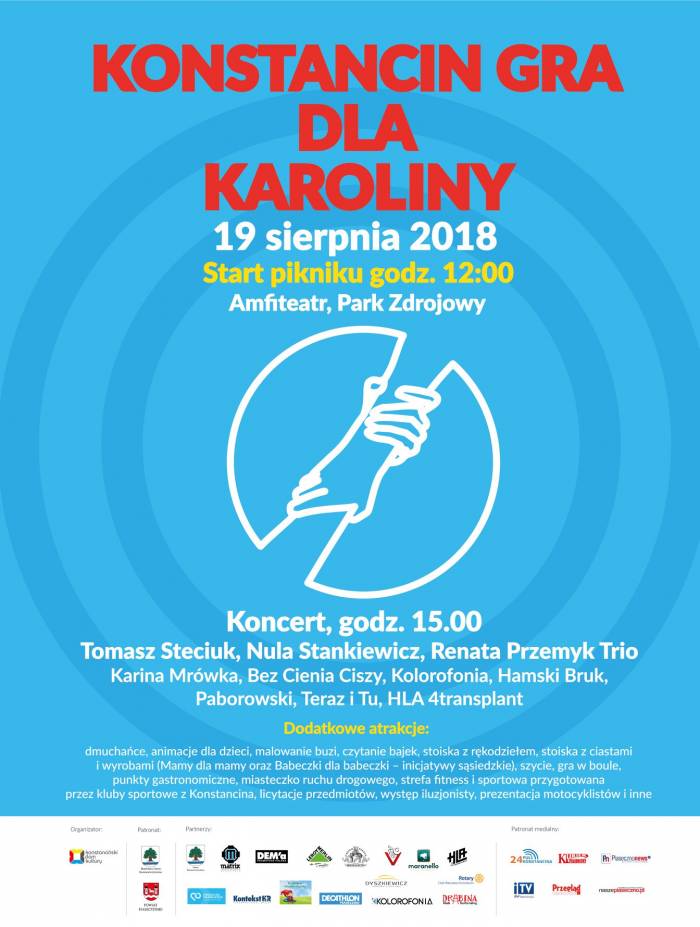 19 sierpnia 2018 roku w godzinach 12:00 - 22:00 Konstancin zagra dla Karoliny. Wystąpią m.in. Tomasz Steciuk, Nula Stankiewicz oraz lokalni twórcy: Karina Mrówka z zespołem, Bez Cienia Ciszy, Kolorofonia, Hamski Bruk, Paborowski, Tearaz i TU, HLA 4TRANSPLANT. Koncert zwieńczy występ doskonałej wokalistki Renaty Przemyk (ok. godz. 20).