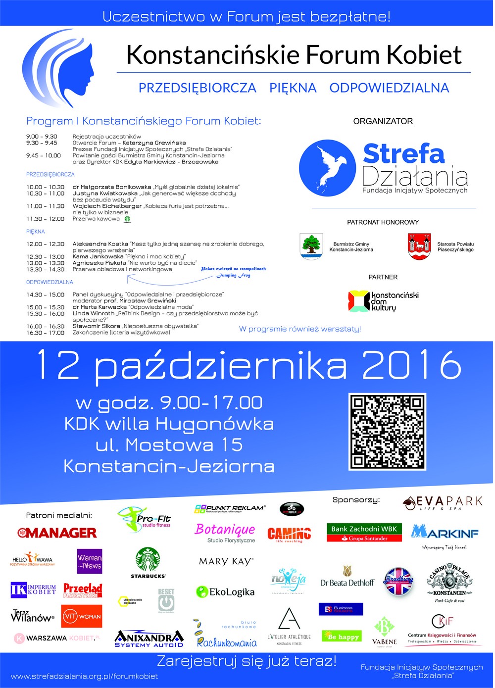 12 października 2016 r. Fundacja „Strefa Działania” w partnerstwie z Konstancińskim Domem Kultury, pod honorowym patronatem Burmistrza Gminy Konstancin Jeziorna oraz Starostwa Powiatu Piaseczyńskiego organizują I Konstancińskie Forum Kobiet. Celem Forum jest szerzenie idei odpowiedzialności w biznesie jak również integracja lokalnej społeczności. Chcemy promować kobiety przedsiębiorcze, kreatywne i odpowiedzialne oraz wspierać te, które znalazły się na zakręcie życiowym i potrzebują bodźca aby przerwać impas i zacząć działać. Forum odbędzie się w siedzibie Konstancińskiego Domu Kultury, przy ul. Mostowej 15 w Konstancinie Jeziornie w godzinach od 9.00 do 17.00.