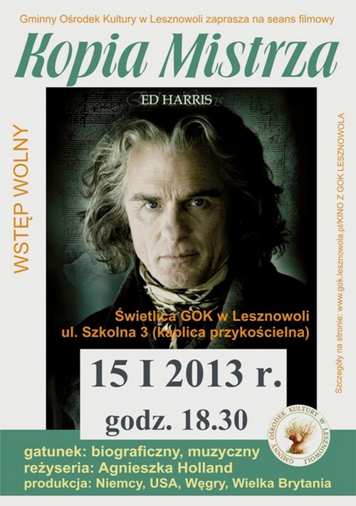 15 stycznia 2013 roku o godz. 18.30 zapraszamy na piękną opowieść o życiu i twórczości wielkiego kompozytora Ludwiga van Beethowena pt. Kopia Mistrza. Seans odbędzie się w świetlicy GOK Lesznowola w kaplicy kościelnej przy ul. Szkolnej 3 w Lesznowoli. Wstęp wolny. Zapraszamy.