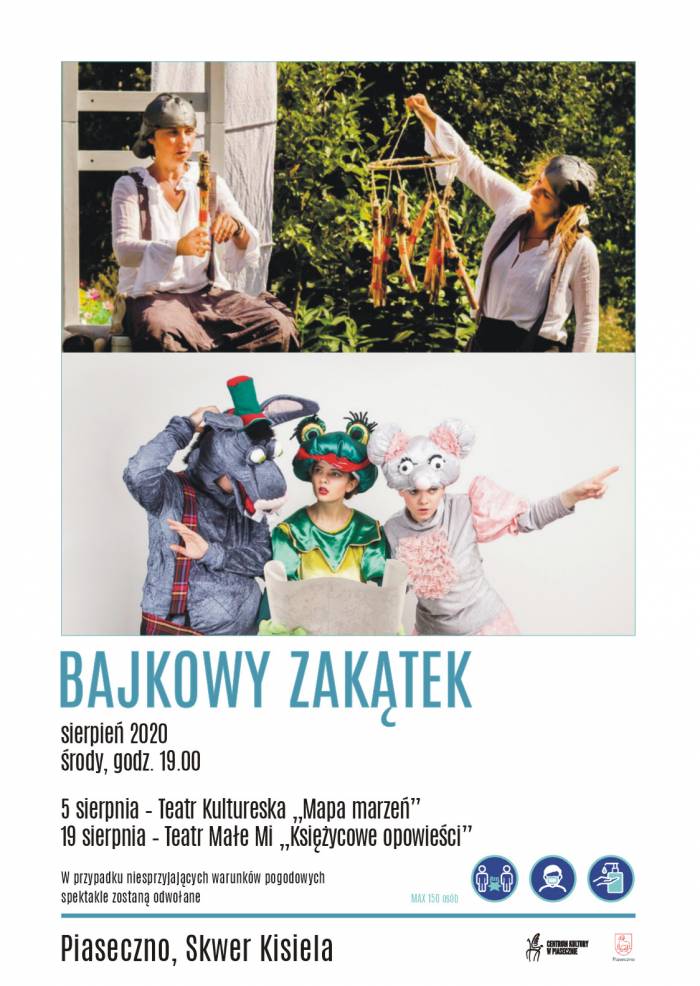 19 sierpnia o godz. 19.00 wystąpi Teatr Małe Mi „Księżycowe opowieści”. Miejsce: skwer Kisiela w Piasecznie. Księżycowe Opowieści, to pięć pięknych historii, przypowieści, bajek filozoficznych z różnych stron świata. Jest tu historia z daleko Nepalu, bajka afrykańska, żydowska, dwie opowieści zaczerpnięte z mitologii indiańskiej. Każda historia zilustrowana scenografią i lalkami autorstwa Kasi Szpilkowskiej.