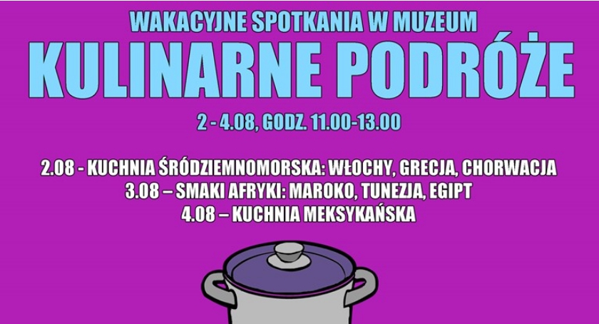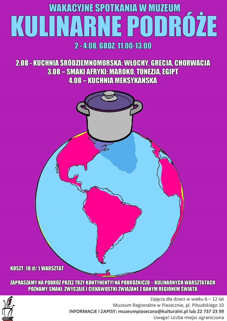 Zapraszamy na Kulinarne podróże. TERMIN : 2-4.08.2016, godz. 11.00 - 13.00 MIEJSCE: Muzeum Regionalne w Piasecznie, pl. Piłsudskiego 10 KOSZT: 10 zł/ 1 warsztat ZGŁOSZENIA: [email protected] lub 22 737 23 99 Liczba miejsc ograniczona.