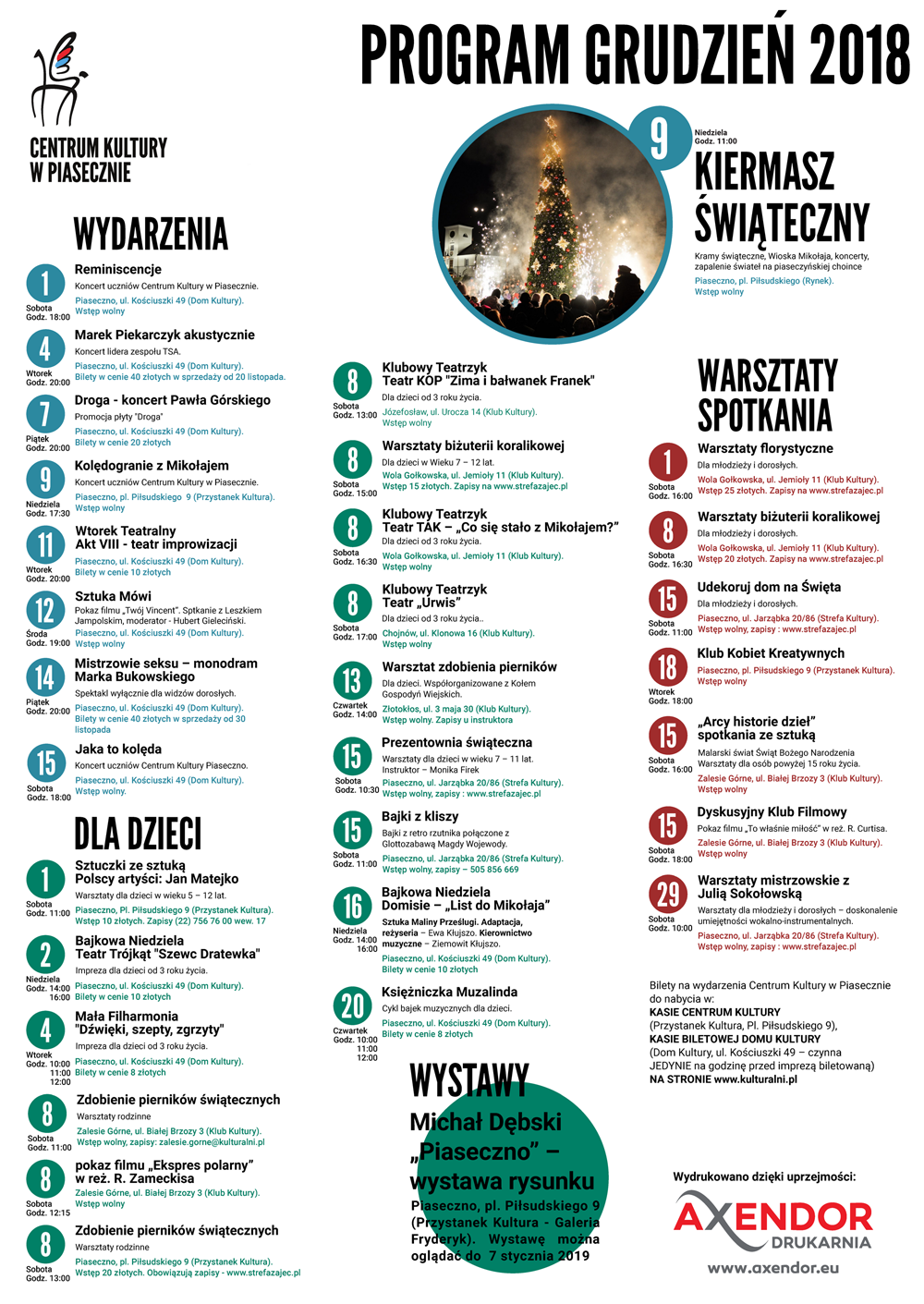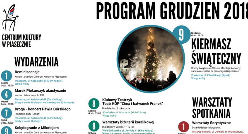Zachęcamy mieszkańców do zapoznania się z kalendarium wydarzeń, które Centrum Kultury w Piasecznie przygotowało na grudzień 2018 roku. Każdy znajdzie coś dla siebie.