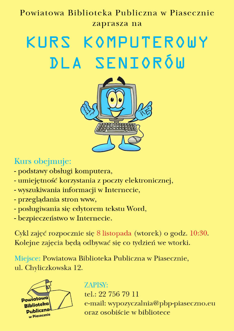 Zapraszamy na kurs komputerowy dla seniorów w Powiatowej Bibliotece Piaseczno. Szczegóły na plakacie:
