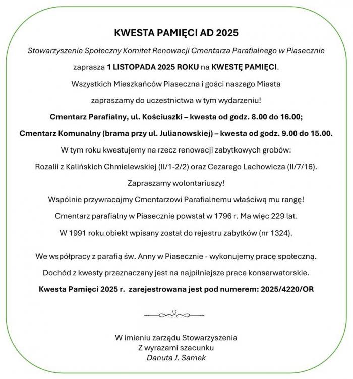 Włączmy się wspólnie w ochronę naszego lokalnego dziedzictwa! Stowarzyszenie Społeczny Komitet Renowacji Cmentarza Parafialnego w Piasecznie po raz kolejny organizuje doroczną Kwestę Pamięci na rzecz ratowania zabytkowych nagrobków.