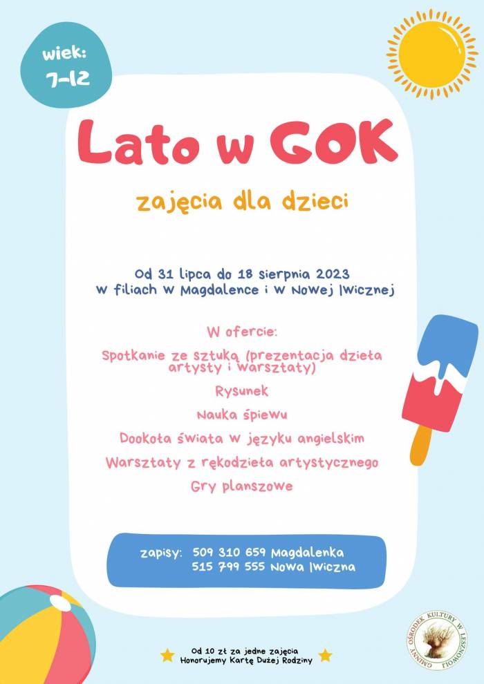 Gminny Ośrodek Kultury w Lesznowoli zapraszam wszystkie dzieci od 7 do 12 roku życia do skorzystania z oferty "Lato w GOK". Zajęcia będą odbywały się od 31 lipca do 18 sierpnia 2023 roku w filiach w Magdalence i w Nowej Iwicznej.
