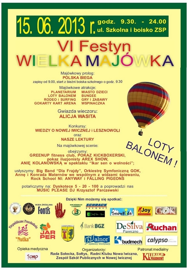 9.30 - start do biegu w ramach akcji POLSKA BIEGA 2013;12.00 - otwarcie VI Festynu WIELKA MAJOWKA 2013;12.05 - wręczanie nagród za bieg w akcji POLSKA BIEGA 2013;12.20 - pokaz Greenup12.50 - konkurs czytelniczy NASZE LEKTURY - część I;13.10 -Pokaz Iluzjonisty - ALEX SHOW14.10 - koncert ORKIESTRY SYMFONICZNEJ GMINNEGO OŚRODKA KULTURYw Lesznowoli;14.45 - występ dzieci z klas "0" Zespołu Szkół Publicznych w Nowej Iwicznej;14.55 - występ dzieci z klasy 2B Zespołu Szkół Publicznych w Nowej Iwicznej;15.10 - konkurs czytelniczy NASZE LEKTURY - część II15.30 - koncert Big Band DLA FRAJDY15.50 - pokaz kulturystyczny16.00 - występ dzieci z Niepublicznego Przedszkola NUTKA;16.25 - konkurs wiedzy o Nowej Iwicznej i Gminie Lesznowola;17.15 - pokaz członków Stowarzyszenia Sportowego WIŚNIEWSKI KICKBOXING;17.30 - ANIA i KONRAD MATERNOWIE we wspólnym z widzami śpiewaniu;18.00 - koncert laureatek VIII PIASECZYŃSKIEGO FESTIWALU PIOSENKI ANGIELSKIEJ pod kierownictwem Anny Seidler;18.10 - ZUMBA RZĄDZI - 50 minut ostrego latinofitness;19.00 - GRUPA TEATRALNA ANNY KOLANOWSKIEJ w spektaklu "Ikar sen o wolności";19.30 - koncert zespołów rockowych z Nowej Iwicznej ANYWAY oraz ENSERE;21.00 - koncert ALICJI WASITA22.00 - Dyskoteka 5 - 20 - 100 - DJ KRZYSZTOF PARCZEWSKI;24.00 - zakończenie festynu.