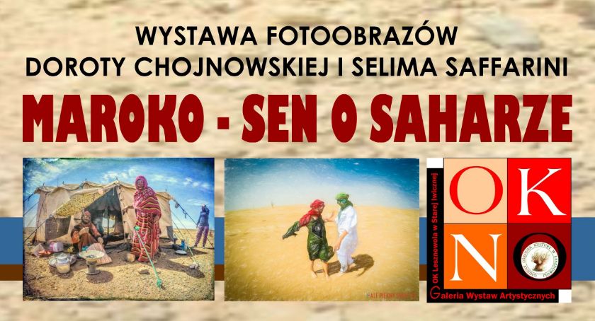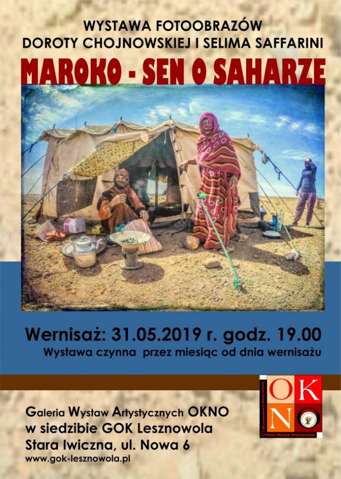 31.05.2019 r. godz. 19.00 - Wernisaż wystawy fotoobrazów pt. "Maroko - Sen o Saharze". Miejsce: Galeria Wystaw Artystycznych OKNO w siedzibie GOK Lesznowola, Stara Iwiczna, ul. Nowa 6.