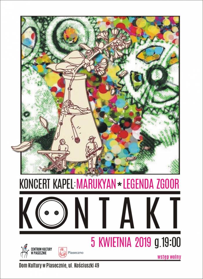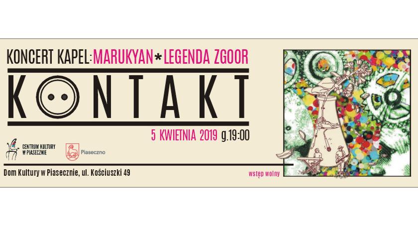 5 kwietnia 2019 roku o godz. 19:00 w ramach cyklu Kontakt, odbędzie się koncert zespołów Marukyan oraz Legenda Zgoor. Wstęp wolny. Miejsce: Dom Kultury przy ul. Kościuszki 49 w Piasecznie. Zapraszamy!
