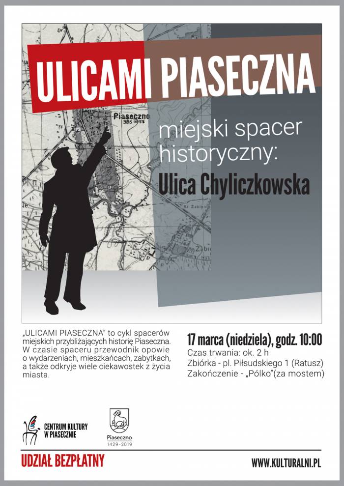17 marca (niedziela), godz. 10.00 ULICAMI PIASECZNA. Miejski spacer historyczny Ulica Chyliczkowska. Zbiórka: pl. Piłsudskiego 1, ratusz; zakończenie: „Pólko”(za mostem). Udział bezpłatny.