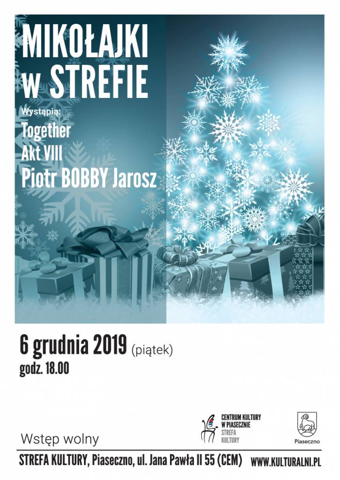 6 grudnia, godz. 18:00 MIKOŁAJKI W STREFIE. Wystąpią: Together, Akt VIII oraz Piotr BOBBY Jarosz. Miejsce: Piaseczno, Strefa Kultury, ul. Jana Pawła II 55 ( CEM). Wstęp wolny.
