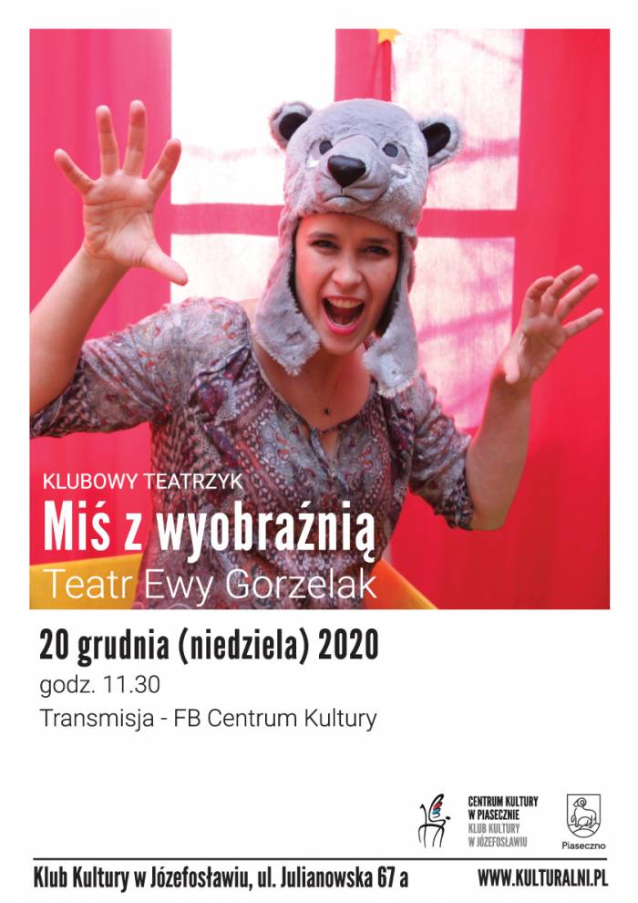 KLUBOWY TEATRZYK Teatr Ewy Gorzelak – „Miś z wyobraźnią” 20 grudnia (niedziela) godz. 11.30 Klub Kultury w Józefosławiu, ul. Julianowska 67A Transmisja – FB Centrum Kultury